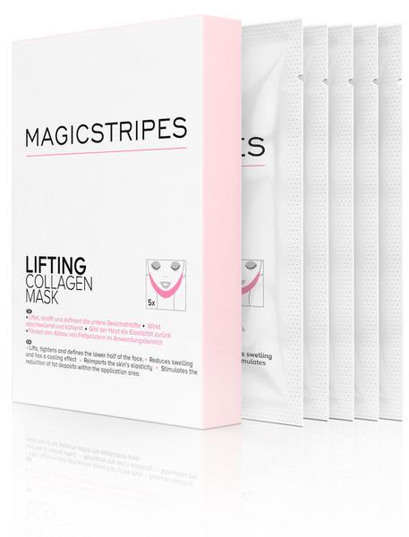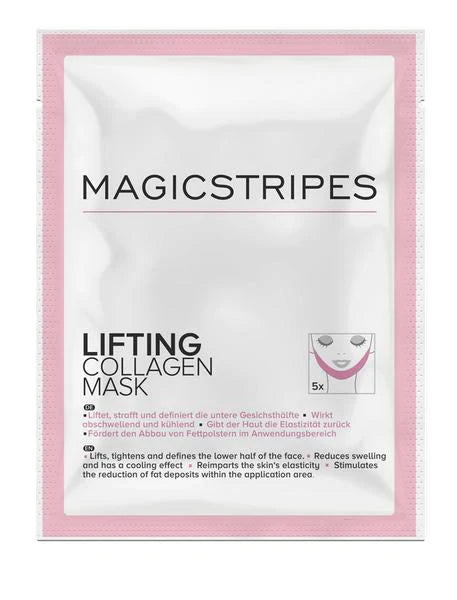The MAGICSTRIPES Lifting Collagen Mask is soaked with an effective cocktail of collagen, caffeine, vitamin C, vitamin E, macadamia nut oil and water, which helps to visibly lift, form and tighten the skin of the lower part of the face. Weakening elasticity of the skin causes wrinkles and tired-looking facial features. The lower half of the face – that is, the lateral cheek area, lateral jaw and chin – is a particular problem area. The mask strengthens the skin in the lower half of the face and helps to lift and tighten this area, visibly defining and beautifying the facial contours.